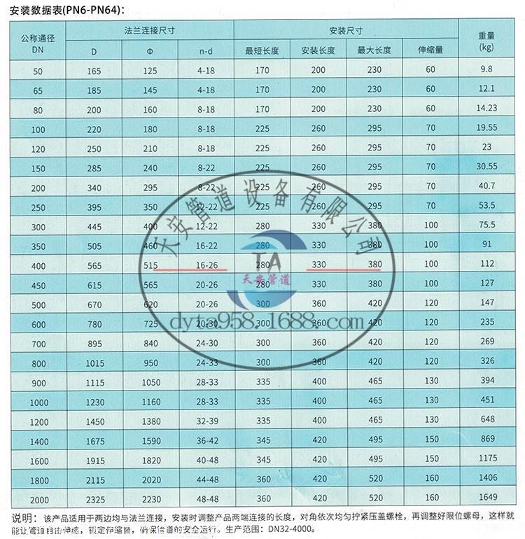 2.在安装过程中,松开填料压板的螺栓,调整安装长度,并根据设计要求安装两端和管道(或阀门,水表),然后检验填料是不是正确安放,并在*之后按下填料压力板,采用对角线方式拧紧螺栓,绝不歪斜,起到预防泄漏的功用。